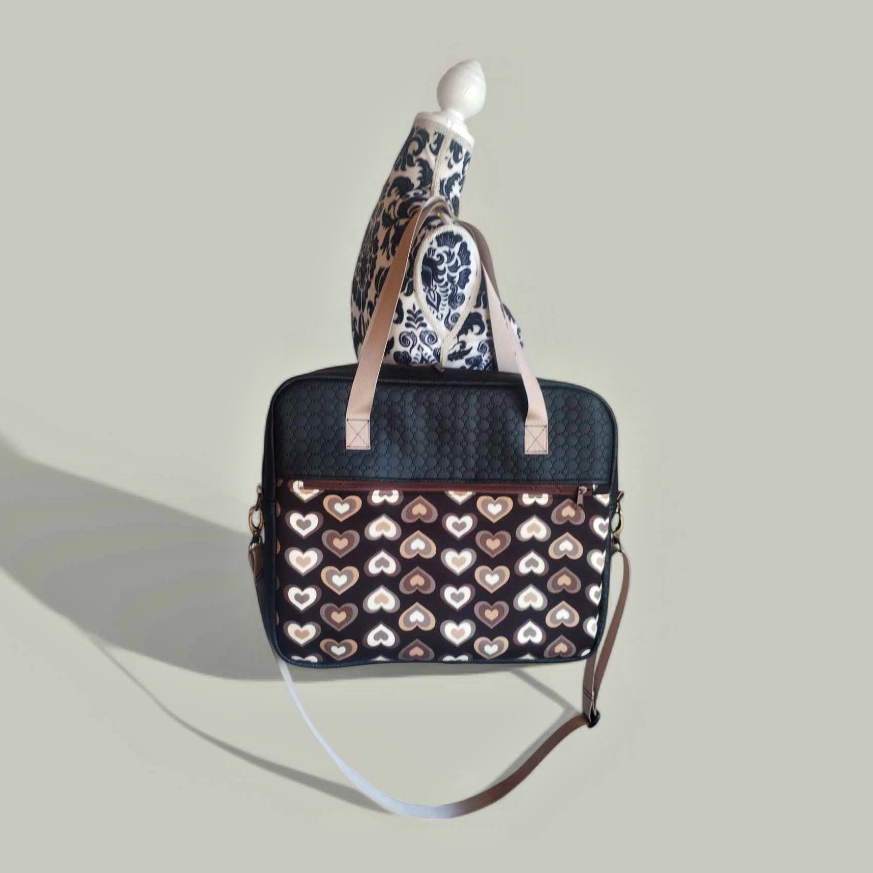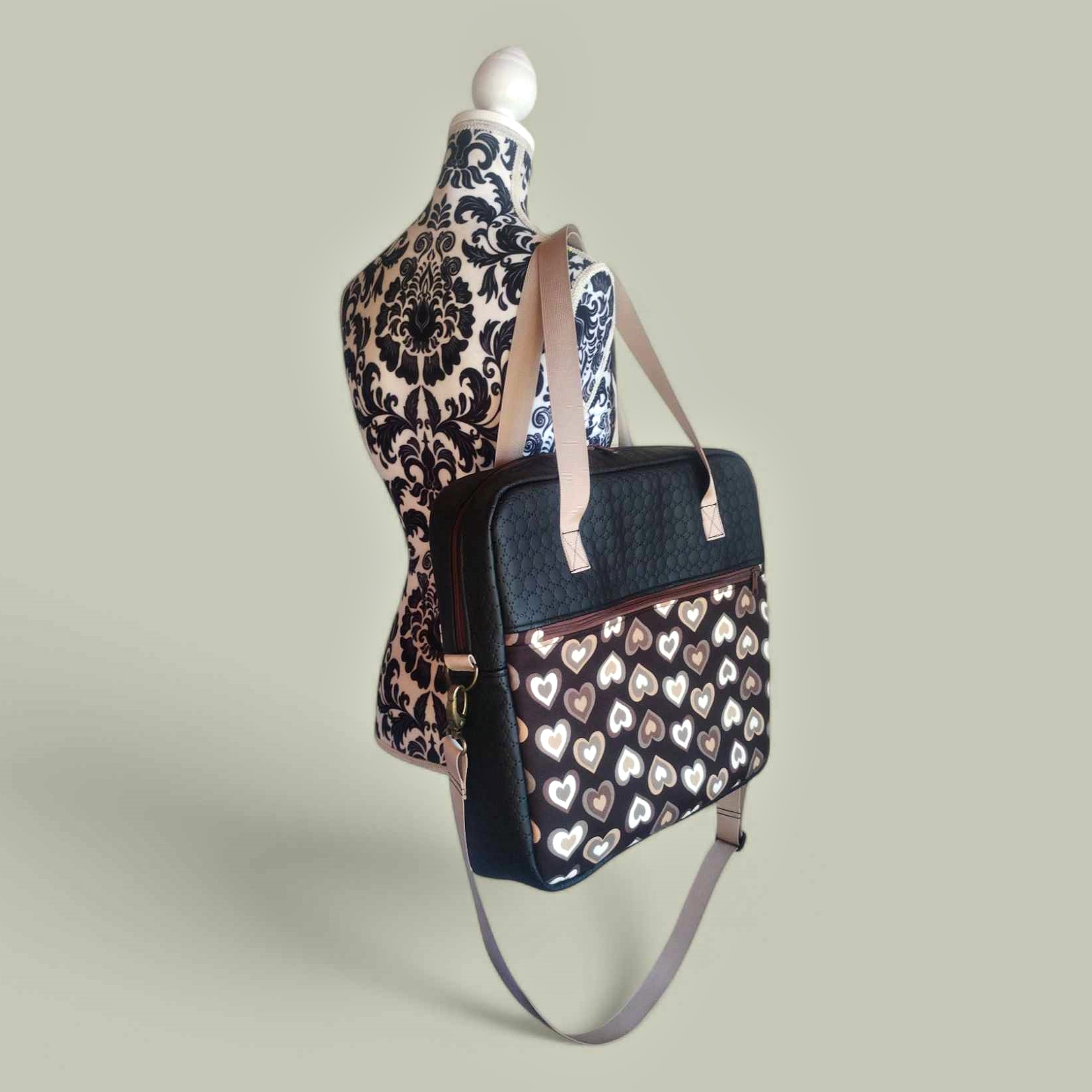 Ta konkretna powstała z czarnej ekoskóry oraz wodoodpornej tkaniny z nadrukiem w czekoladowe serduszka ułożone w misterną, apetyczną mozaikę.
