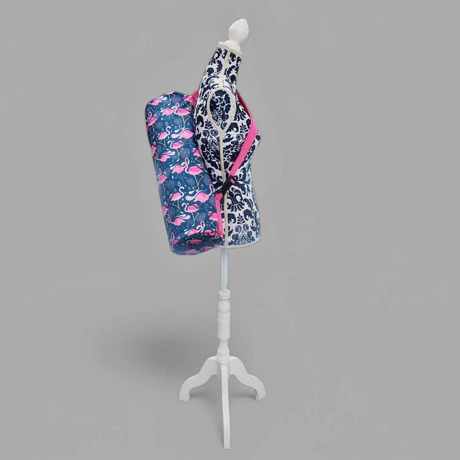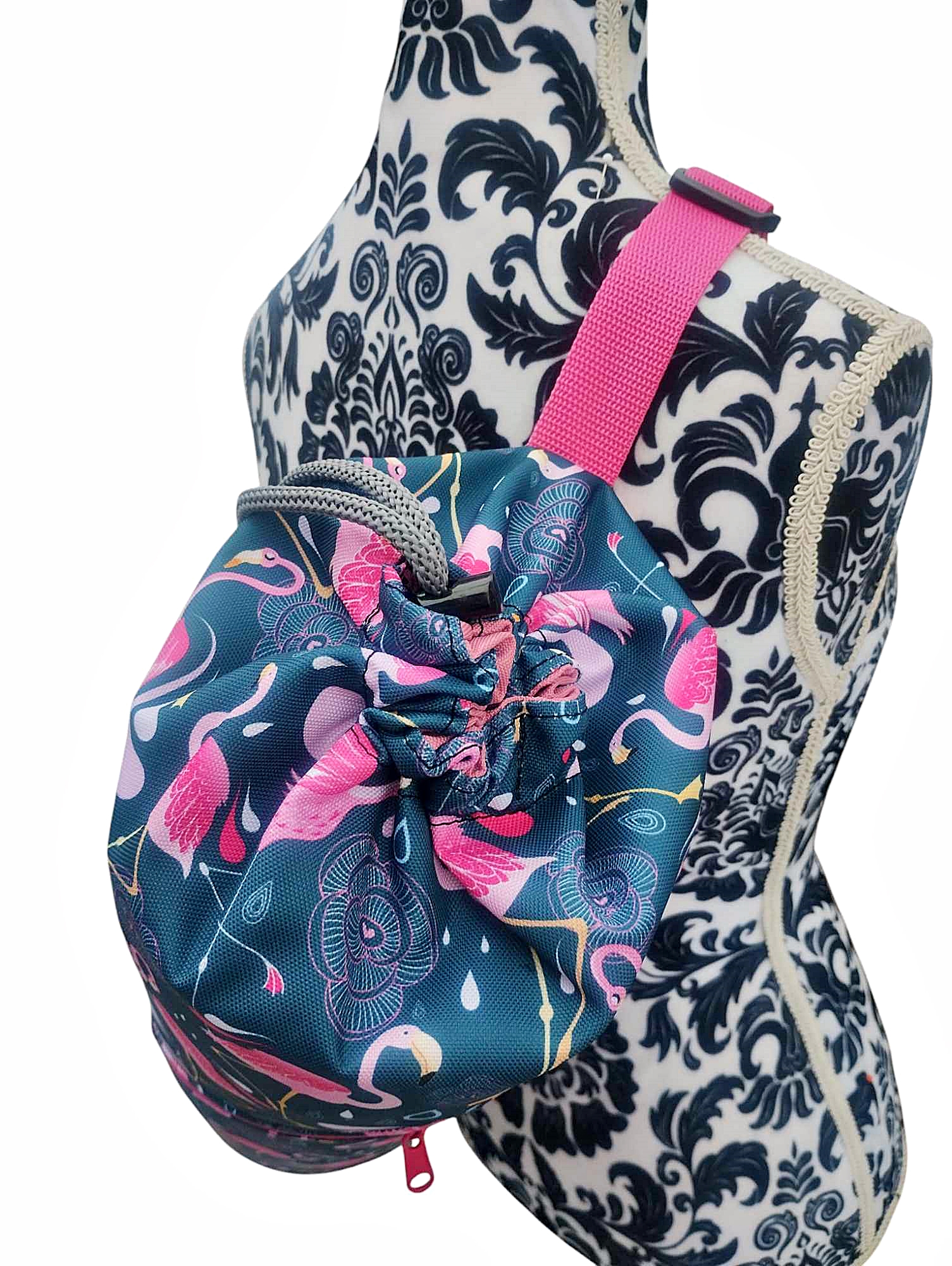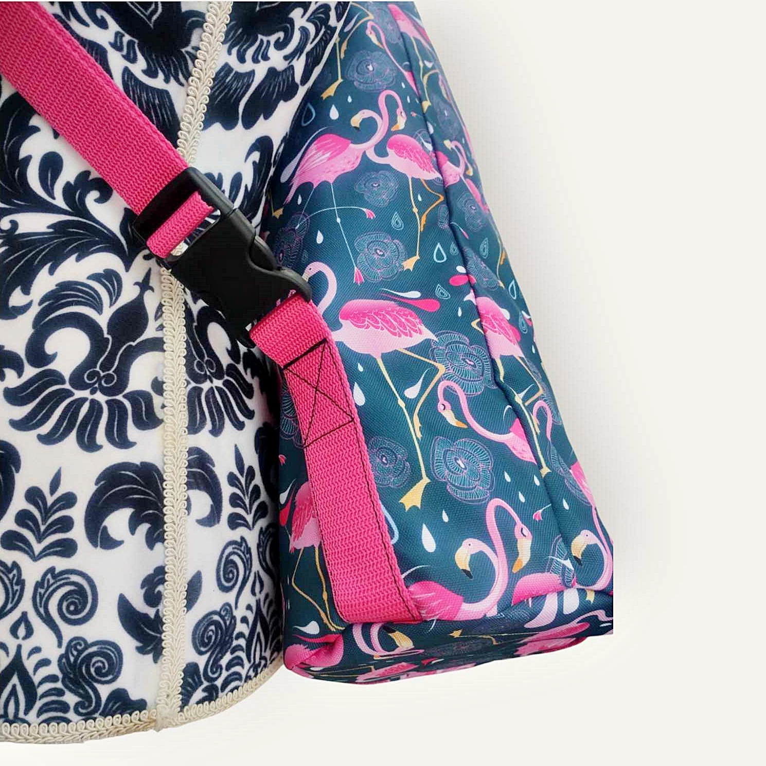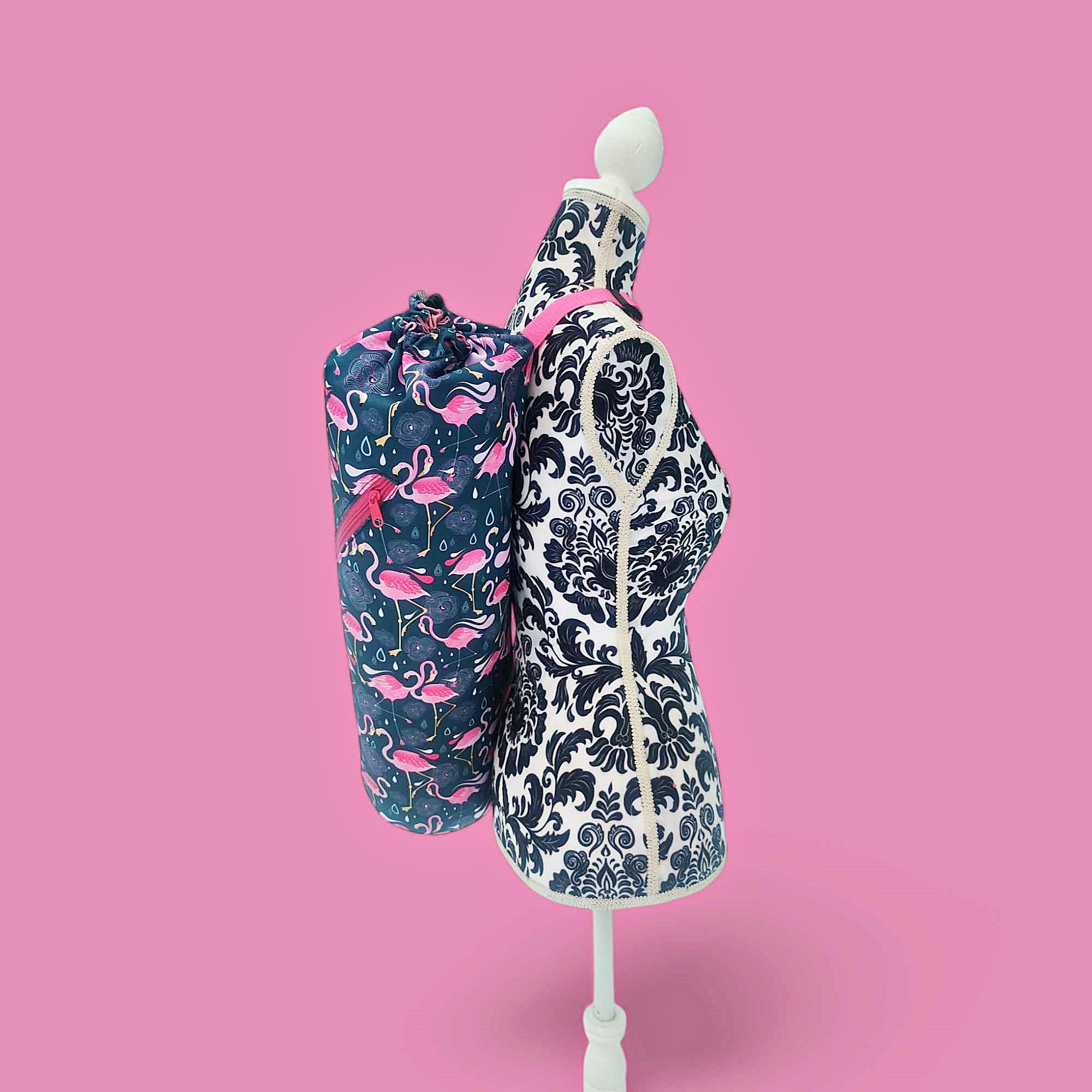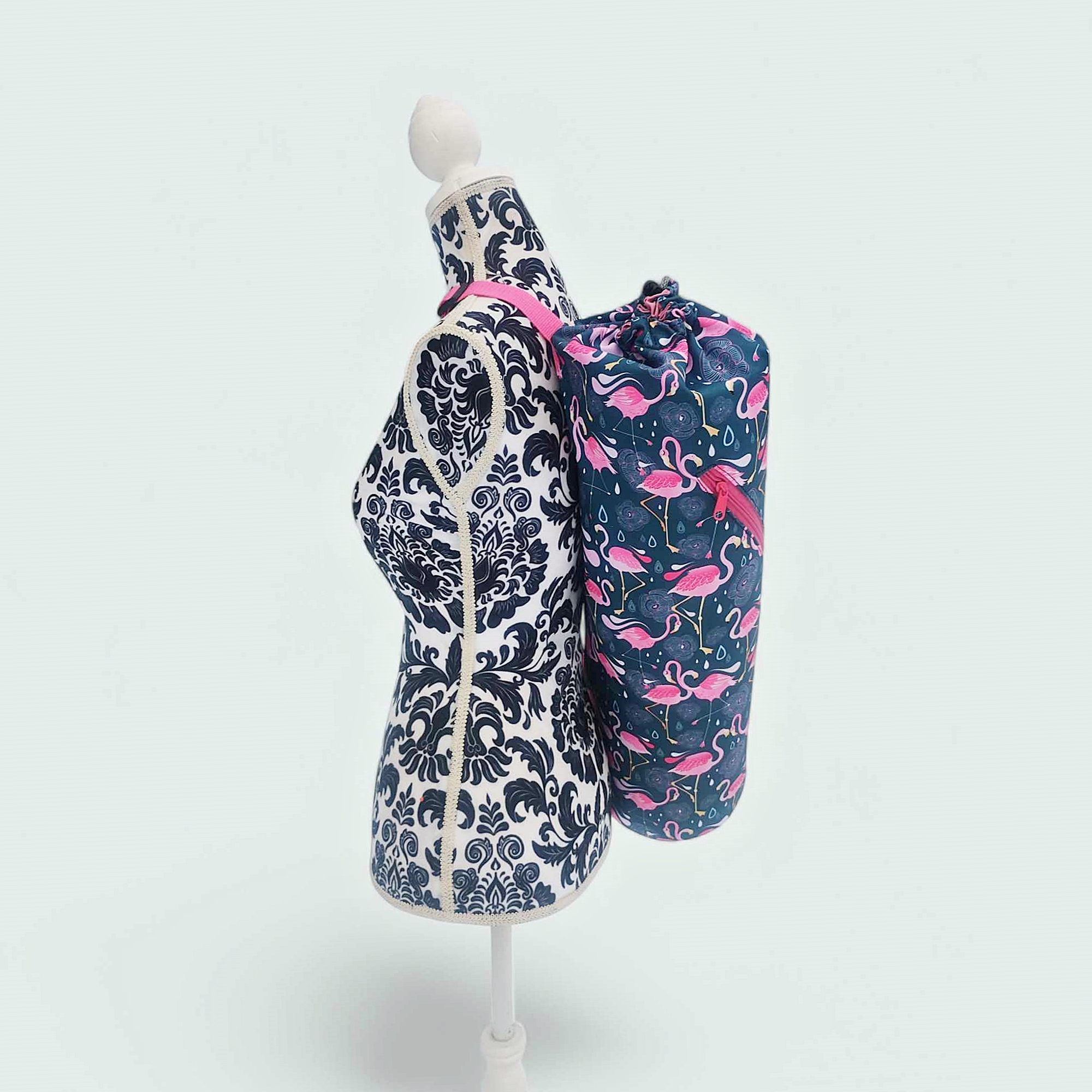 Ta różowa torba na matę do jogi uszyta została z tkaniny wodoodpornej z nadrukiem w różowe flamingi. Posiada kieszeń i reguowany pasek.