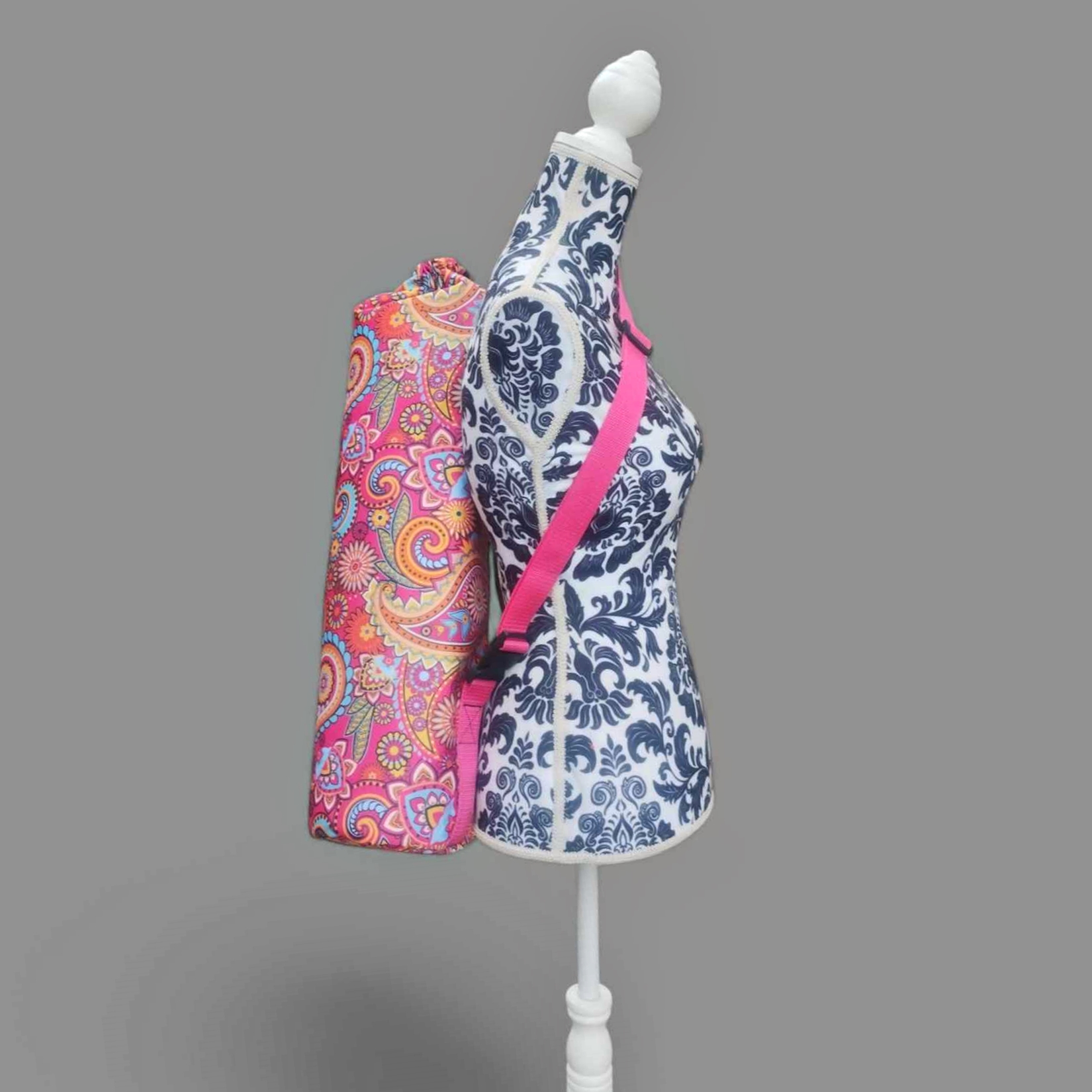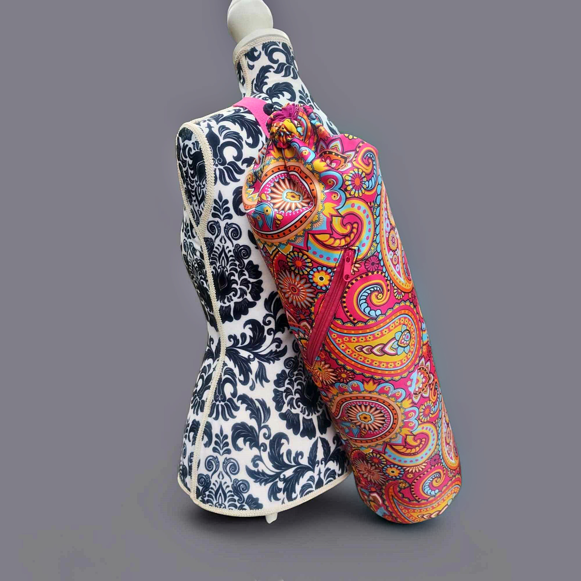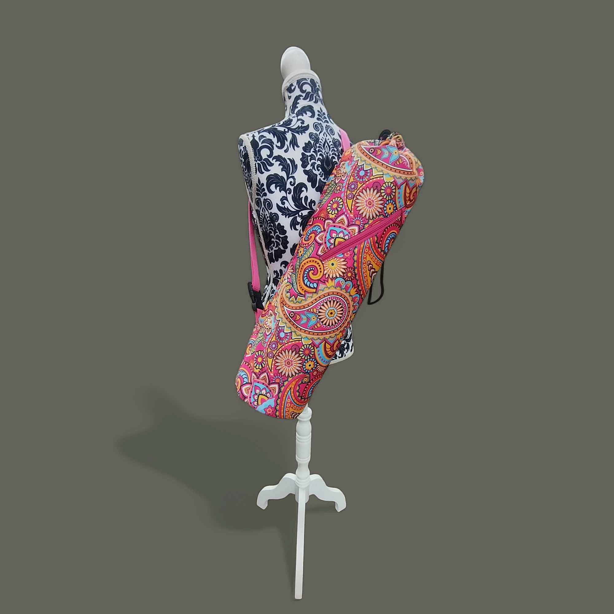 Torba na matę do jogi CHYBAJUTRO to rodzaj worka z okrągłym dnem, z zapinaną kieszenią i regulowanym paskiem. Ta uszyta jest z pięknej różowej tkaniny w orientalny wzór.
