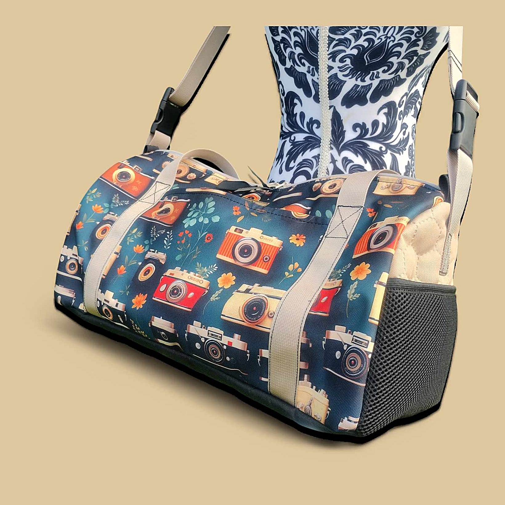 Ta konkretna torba sportowa, zwana w naszej pracowni „torbą na siłkę”, uszyta jest z pięknej ciemnozielonej tkaniny wodoodpornej z nadrukiem w aparaty fotograficzne. Jest zaplanowaa tak, aby pomieściła rzeczy niezbędne, jakie musisz ze sobą zabrać na siłownię, salę treningową, lodowisko lub basen. Z powodzeniem schowasz więc w niej zmienne buty, dres lub strój gimnastyczny, ręcznik, pływackie okulary, kąpielówki i tym podobne rzeczy.